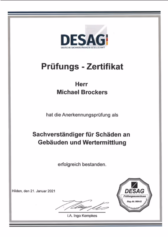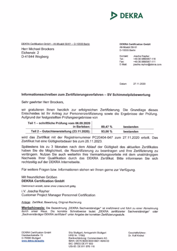 Meine Qualifikation basiert neben meiner praktischen Berufserfahrung auf einem Meisterbrief im Handwerk, einem betriebswirtschaftlichen Studium und diversen Titeln im Sachverständigenwesen. Als DEKRA cert. Sachverständiger für Schimmelpilzbewertungen und Bauforensiker wird mein Profil als Experte für Bau- Schimmelschäden abgerundet.